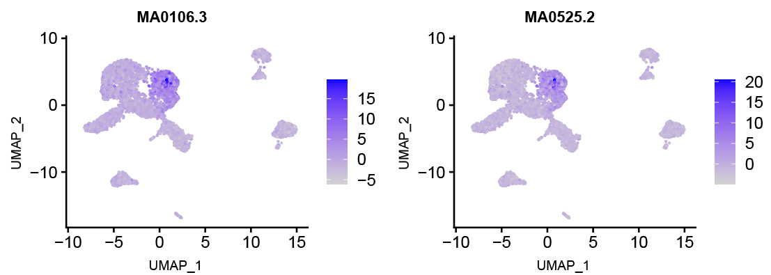 • After running the analysis, a new assay named "chromvar" will be added to the object. You can use Seurat's FeaturePlot to visualize motif activity.