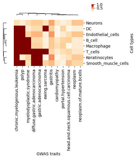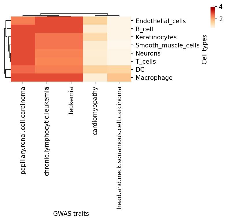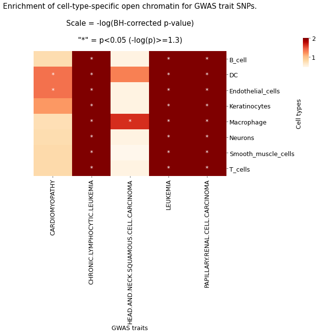 The heatmap shows the enrichment of GWAS trait-associated SNPs in cell-specific open chromatin regions. Colors represent -log(p) values corrected by the BH method; greener colors indicate greater significance. '*' indicates corrected p-value < 0.05, meaning GWAS traits are significantly enriched in the corresponding cell type.Result Files