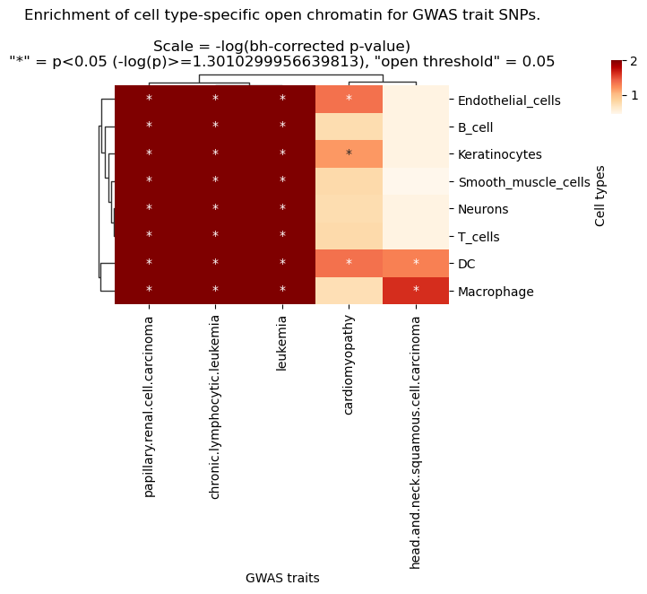g.ax_col_dendrogram.set_title(f'Enrichment of cell-type-specific open chromatin for GWAS trait SNPs.\n\nScale = -log(BH-corrected p-value)\n\n"*" = p<{pval_sig_threshold} (-log(p)>={round(neglog10_pval_sig_threshold,2)})')
