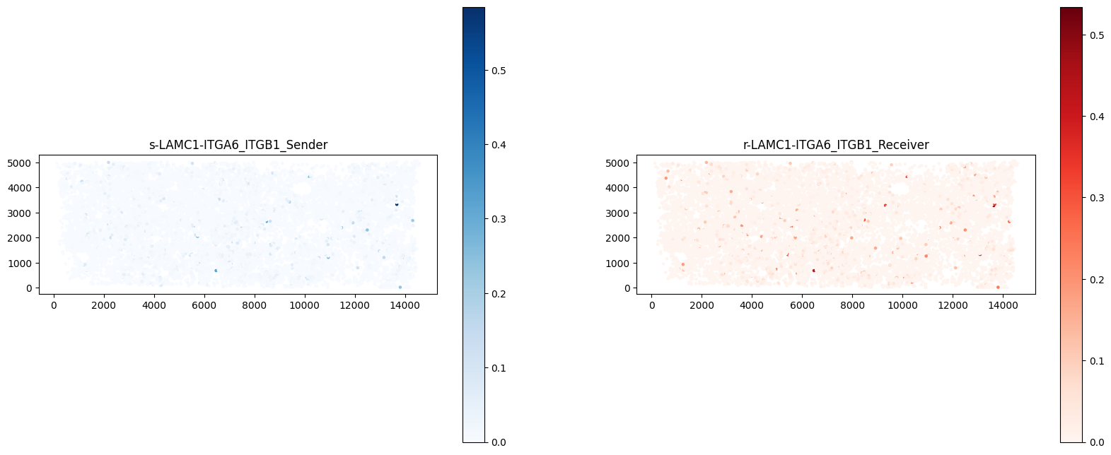 Receptor-ligand co-expression. Left plot represents ligand expression; right plot represents receptor expression; darker color means higher expression. If receptor and ligand are expressed in the same region, it is inferred that interaction occurs between cells expressing this receptor-ligand pair. (Shown here for one receptor-ligand pair)#ct.tl.communication_direction(a_dis500, database_name=lr_database, pathway_name='PSAP', k=5)