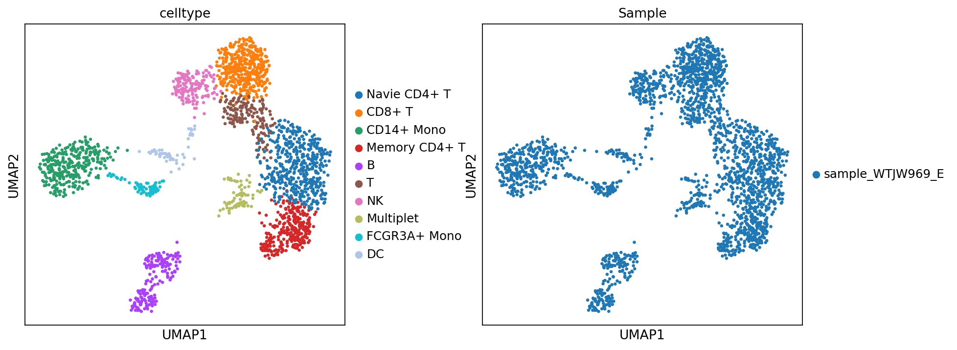 celltype: Cell type annotation based on transcriptome data.leiden: Clustering results based on MOFA factors.CpG%: Genome-wide CpG methylation level.Sample: Sample source.