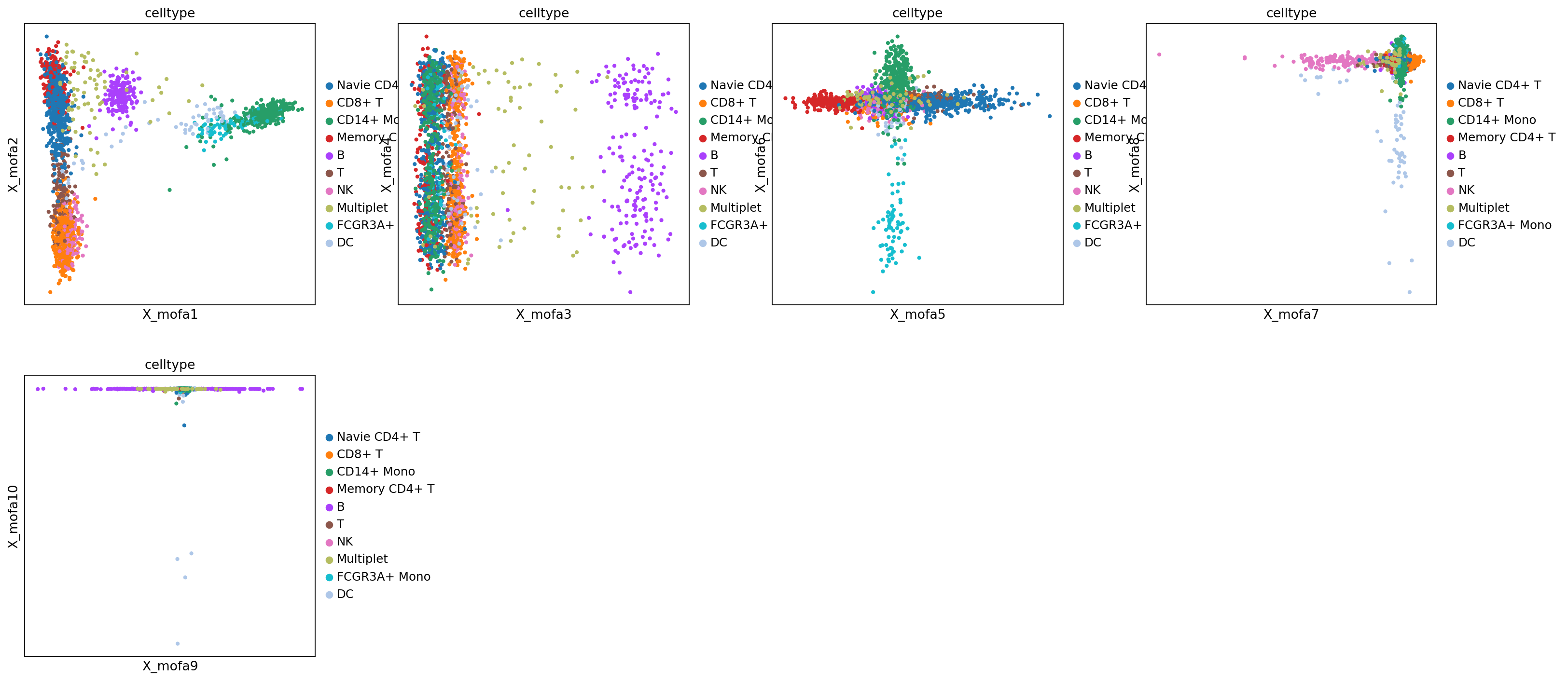mu.pl.mofa(mdata, color="celltype", components=["1,2", "3,4", "5,6", "7,8", "9,10"])