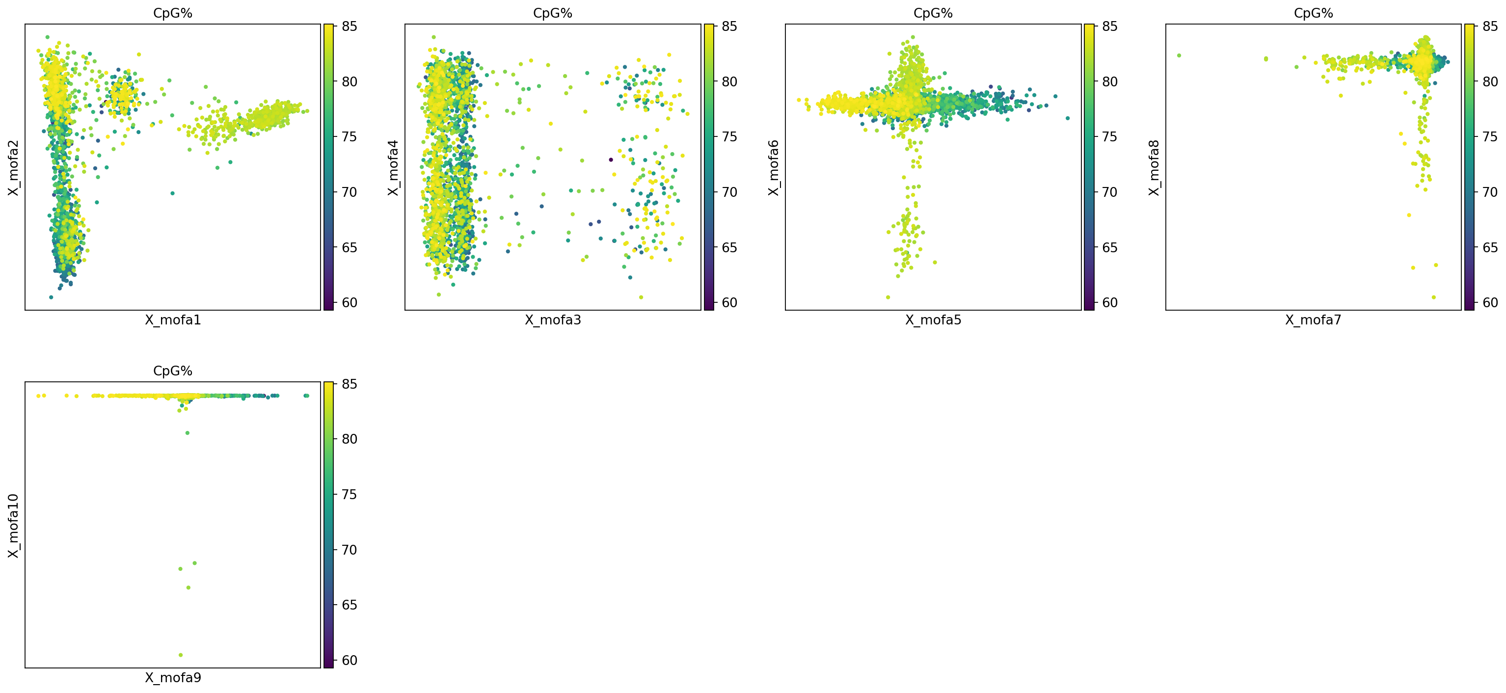 mu.pl.mofa(mdata, color="CpG%", components=["1,2", "3,4", "5,6", "7,8","9,10"])