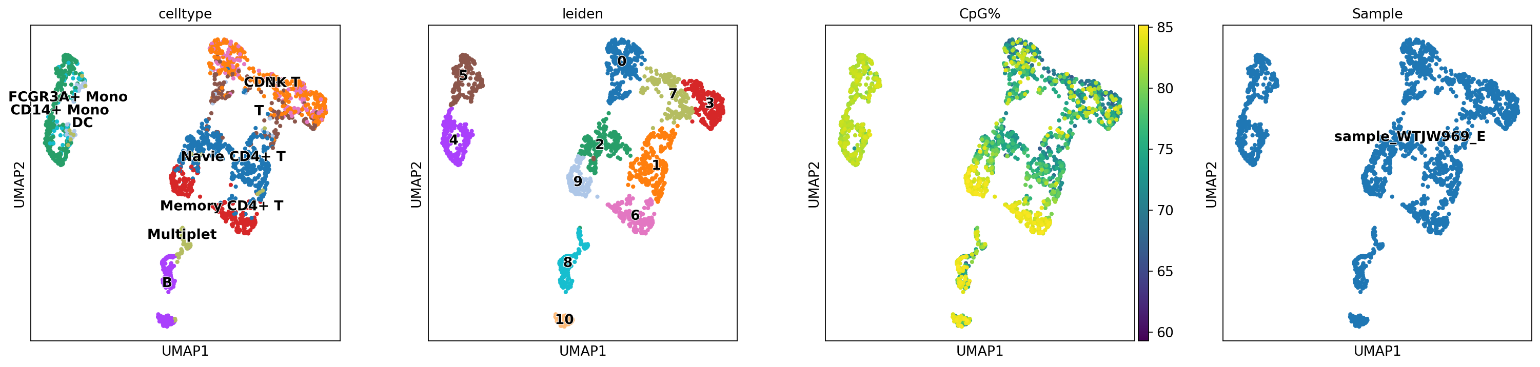 sc.pl.umap(mdata, color=["celltype","leiden",'CpG%', 'Sample'],legend_loc="on data", legend_fontoutline=1)