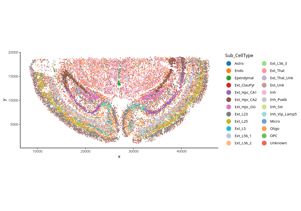 plotSpatial(spe, group.by = "Sub_CellType", pt.alpha = 1,pt.size = 0.5,pt.shape = 16)