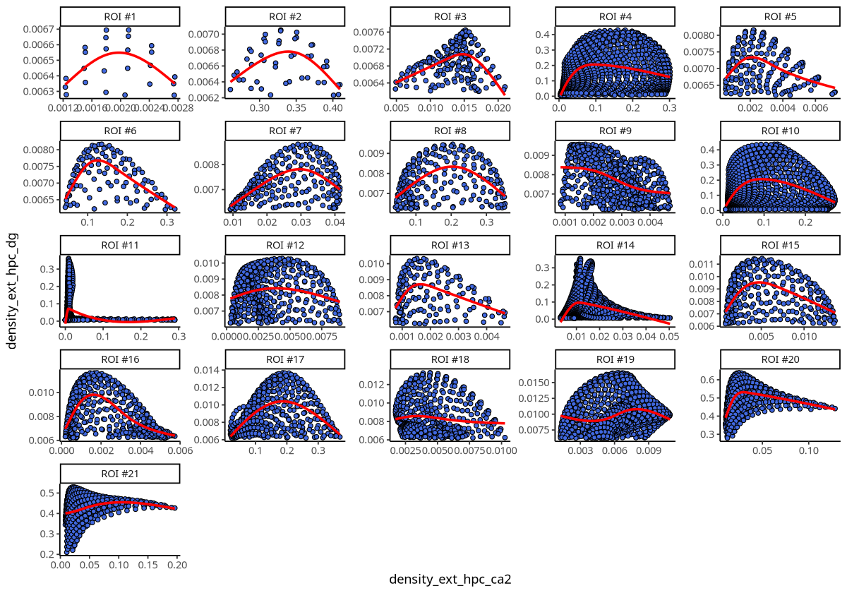 Figure Legend: Density correlation between Ext_Hpc_CA2 and Ext_Hpc_DG cell types in each ROI. Points represent grids of spatial transcriptomics data; x-axis is grid density of Ext_Hpc_CA2, y-axis is grid density of Ext_Hpc_DG.