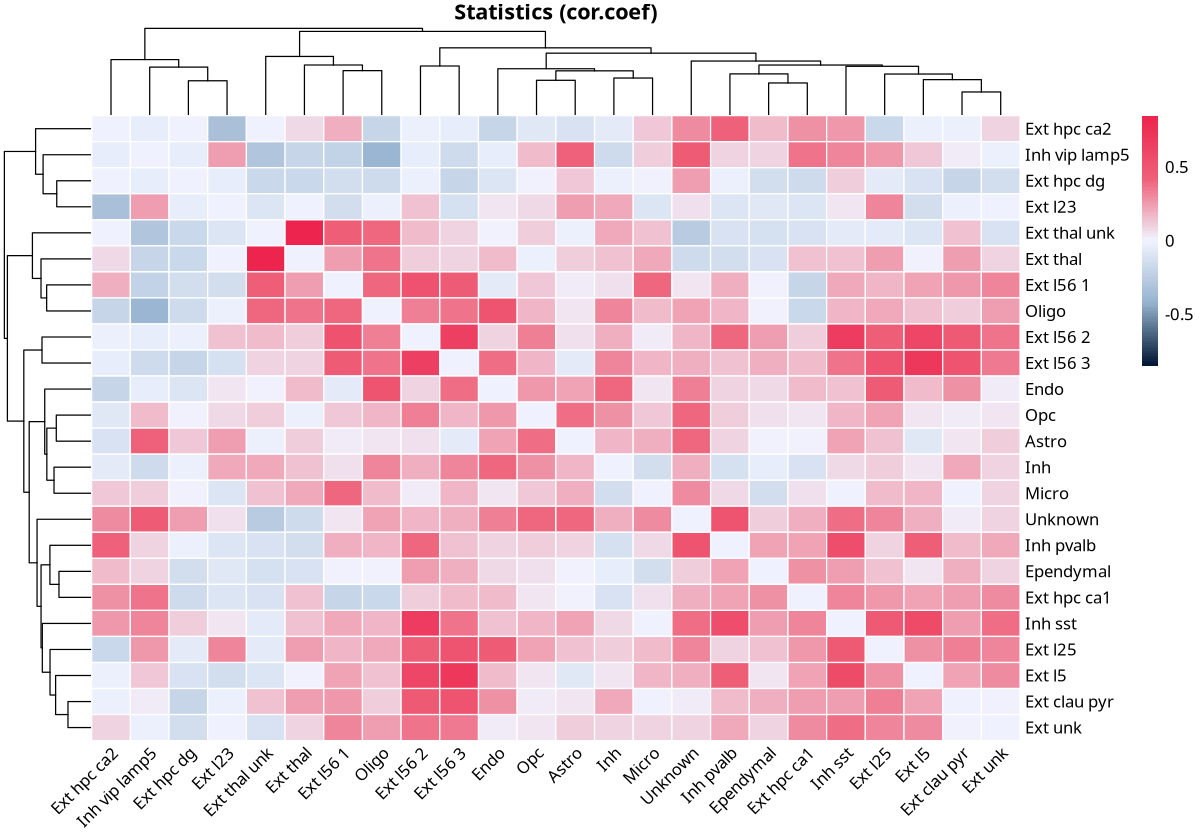 head(as.data.frame(results$overall))| celltype1 | celltype2 | cor.coef | p.Pos | p.Neg | |
