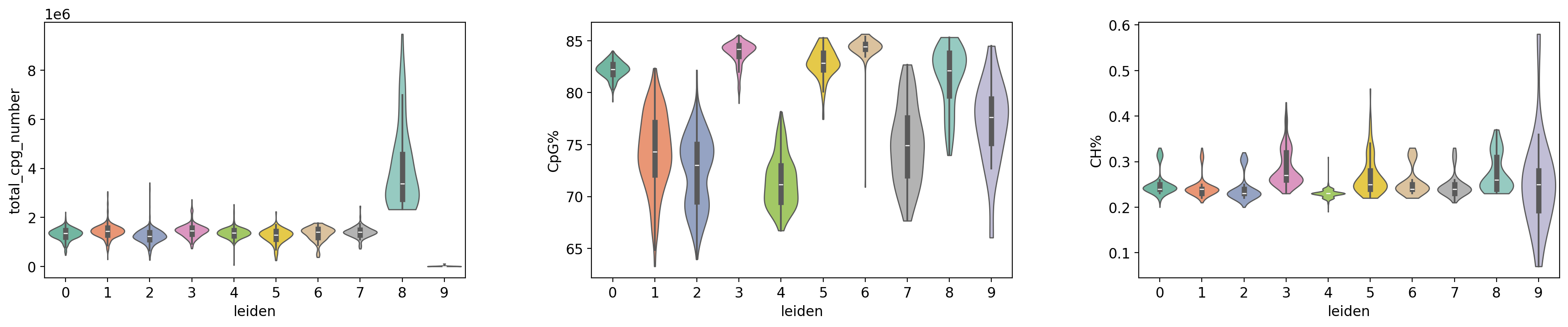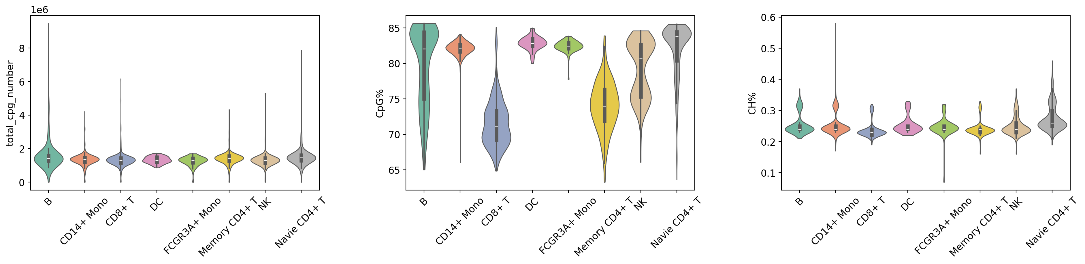 total_cpg_number,CpG%, andCH%.- Violin Plot: Each violin represents a cell group; width indicates cell density in that value range (wider = more cells). Includes a box plot showing median, quartiles, and outliers.