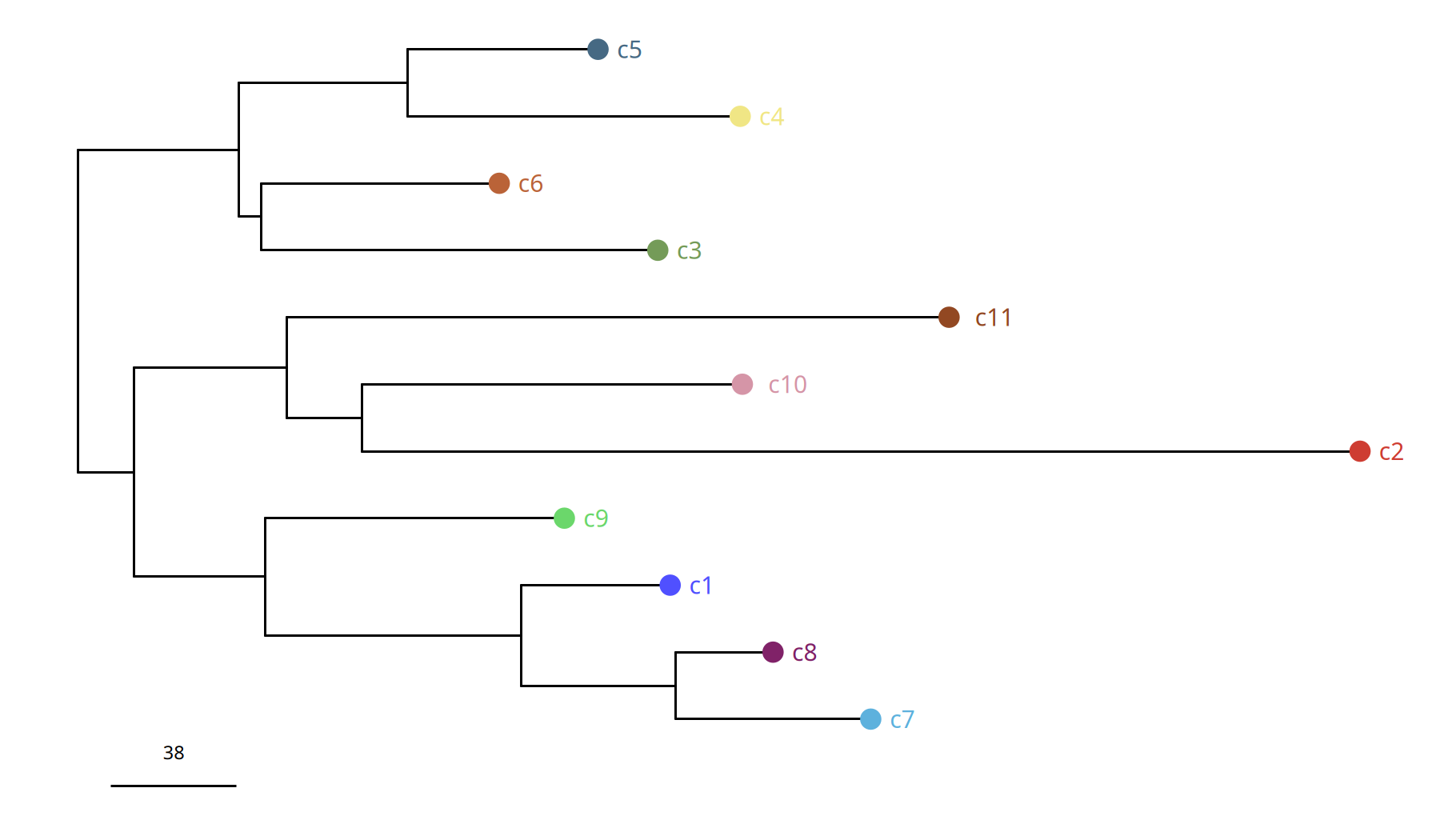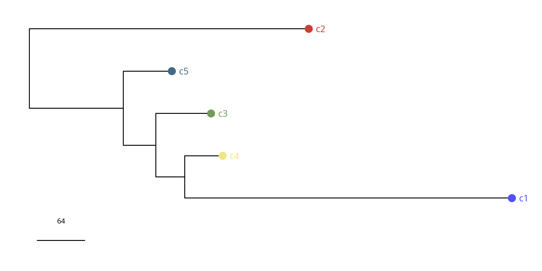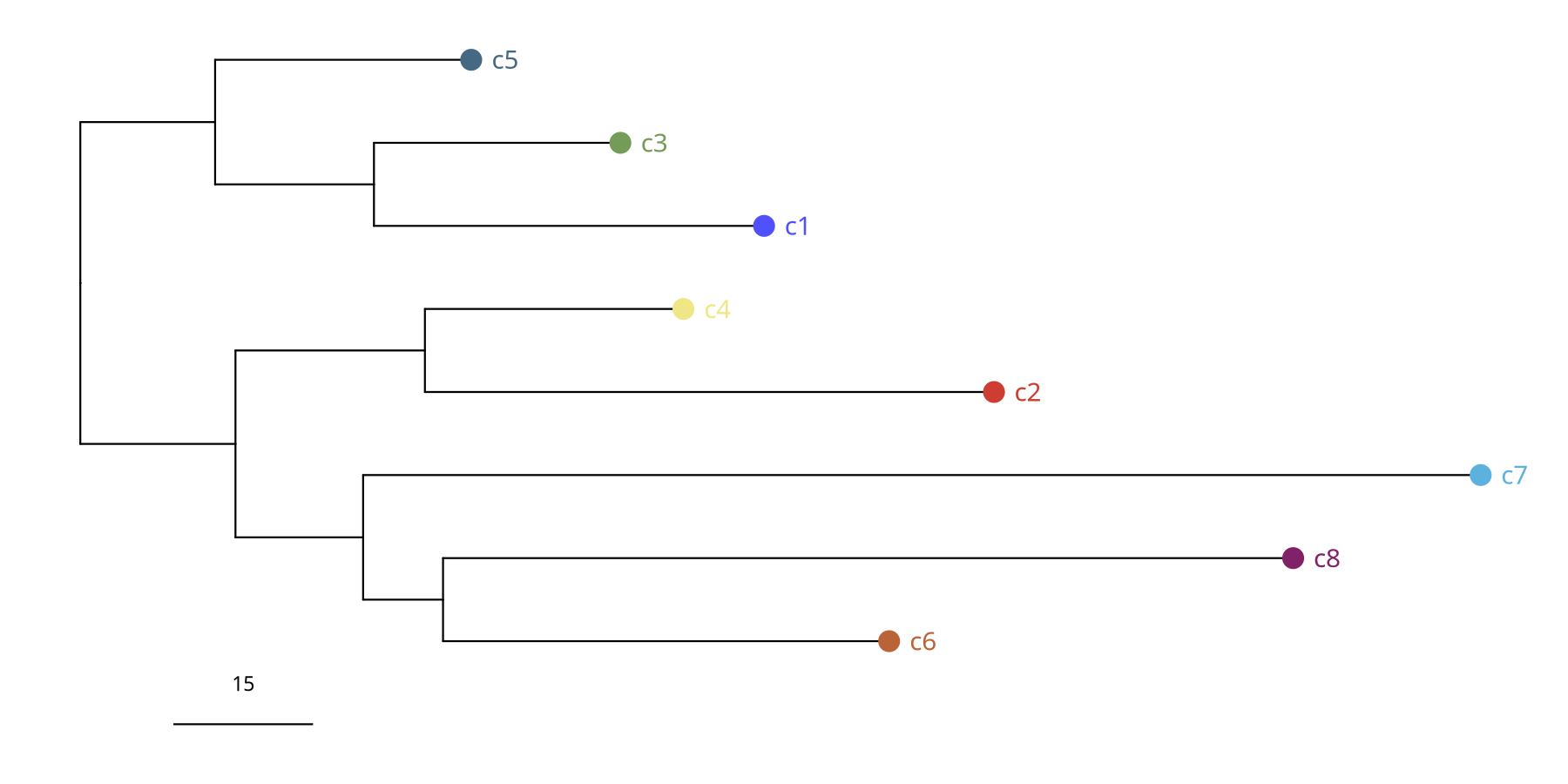 - Branch Length: Represents Manhattan distance, i.e., magnitude of difference in genomic CNV profiles between subclones.