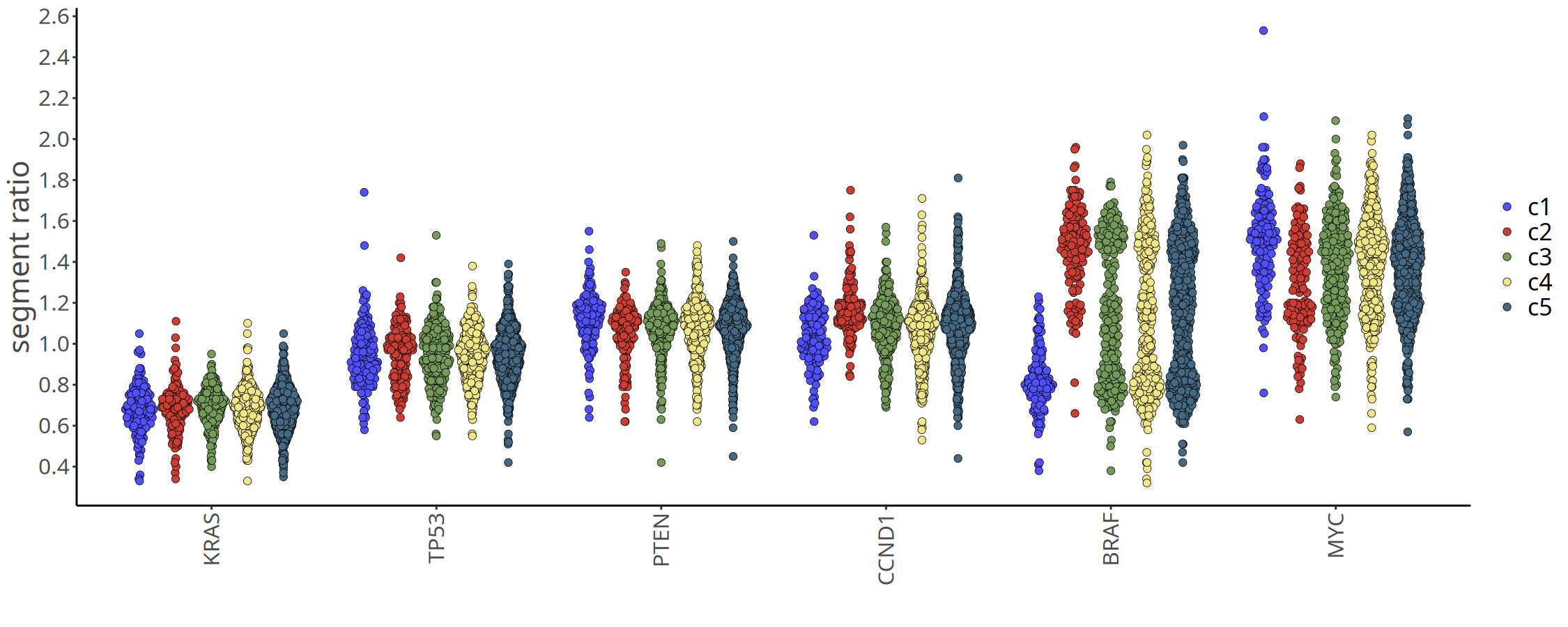 Besides genome-wide profiles, we usually focus on copy number status of specific driver genes (e.g., MYC, TP53, EGFR). The plotGeneCopy function displays copy number distribution of specific genes across subclones. The figure below shows dot plots of driver gene copy numbers only for subclones identified at 220kb resolution.