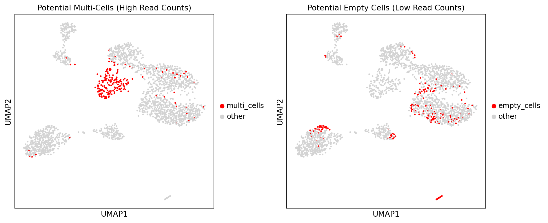 # --- Visualize distribution of potential doublets and empty cells in UMAP space ---