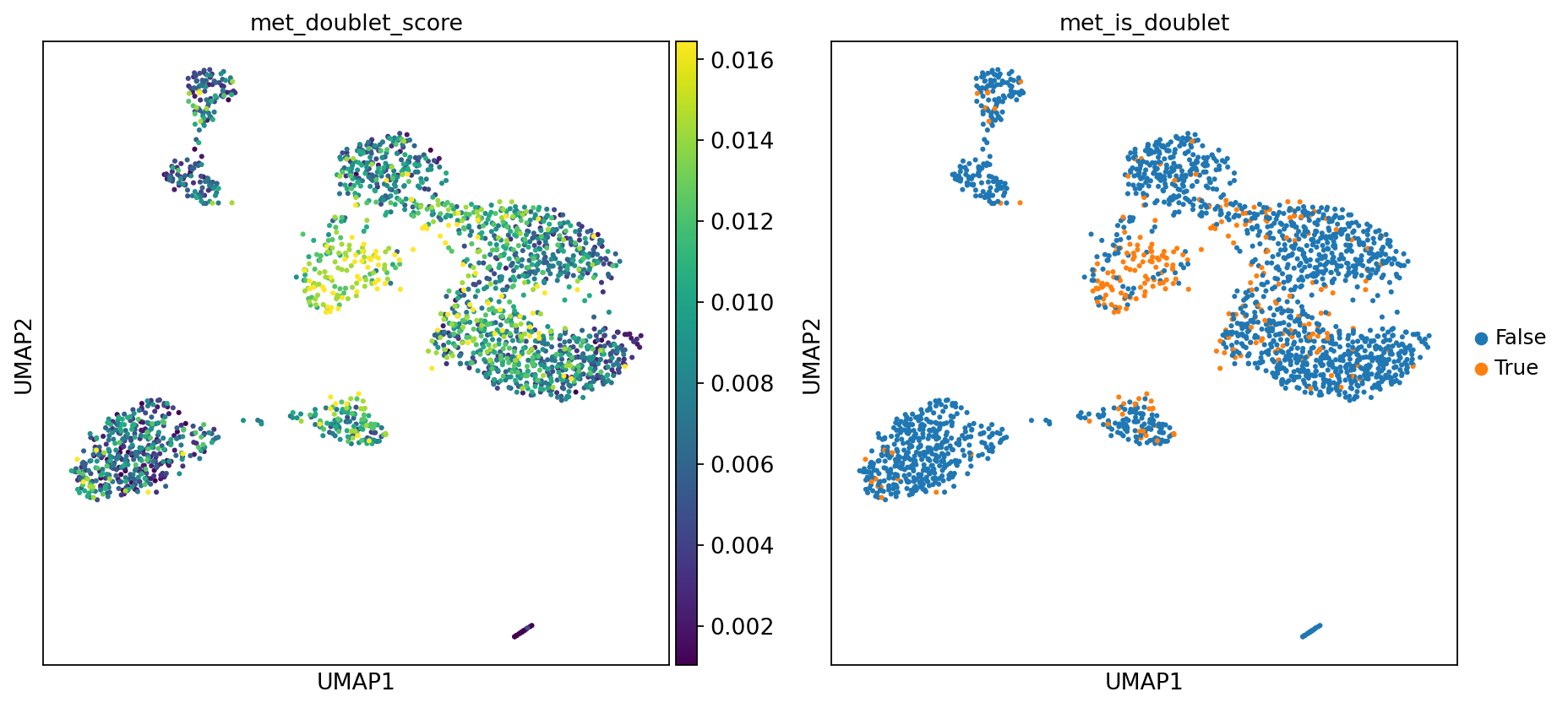 - Left Plot (met_doublet_score): Distribution of doublet scores. Brighter color (yellow) indicates higher similarity to simulated doublet features and higher probability of being a doublet.