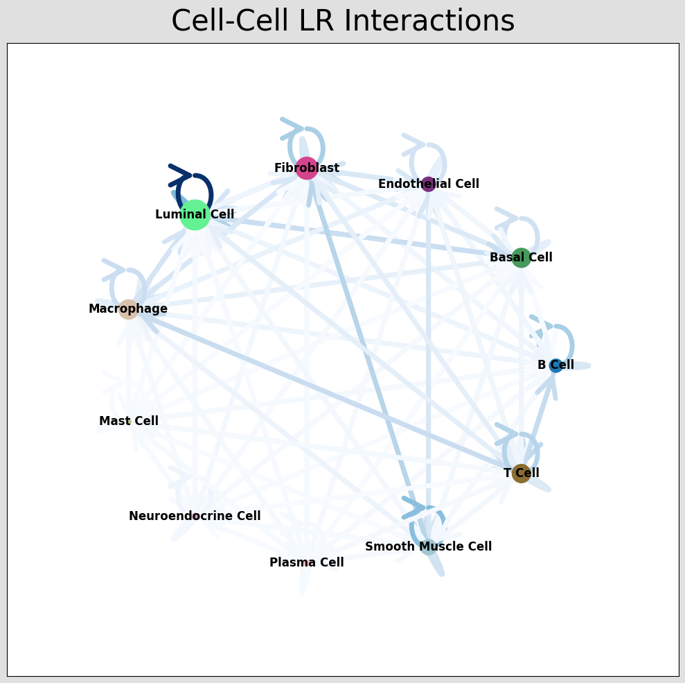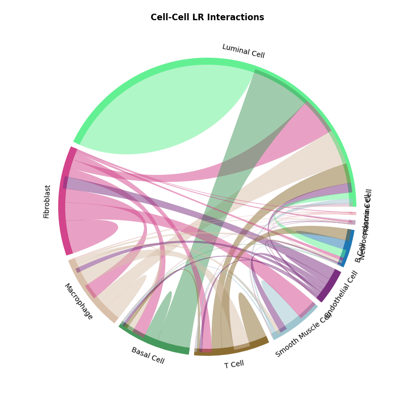 CCI network plot shows cell type interactions for corresponding LR pairs, plotted via per_lr_cci_* results. Each color represents a cell type; lines pointing from a cell type to itself or others represent interactions; line color intensity represents interaction strength.CCI Chord Diagram