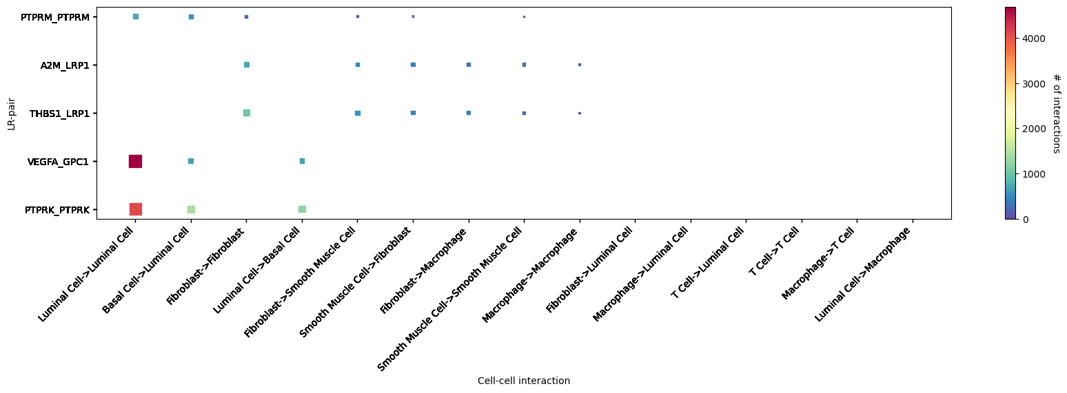 CCI heatmap shows LR interactions corresponding to cell types. X-axis represents interacting cell types; Y-axis represents interacting LRs; color represents interaction strength, redder means stronger. Shows top 5 significantly interacting LR pairs.st.pl.cci_map(a, cluster_name,show=False,figsize=(5,4))
