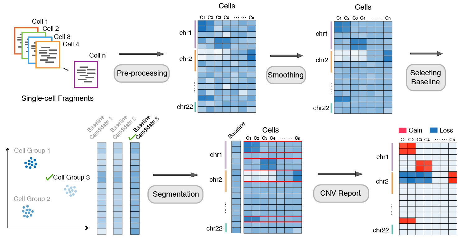 CNV is an important driver of the occurrence and progression of various diseases such as cancer. Traditional CNV analysis is primarily based on whole-genome sequencing (WGS) or whole-exome sequencing (WES), which can only provide population-average information. Single-cell CNV analysis infers the copy number state of each cell at single-cell resolution, enabling the revelation of genomic differences and heterogeneity among different cells within tissues.