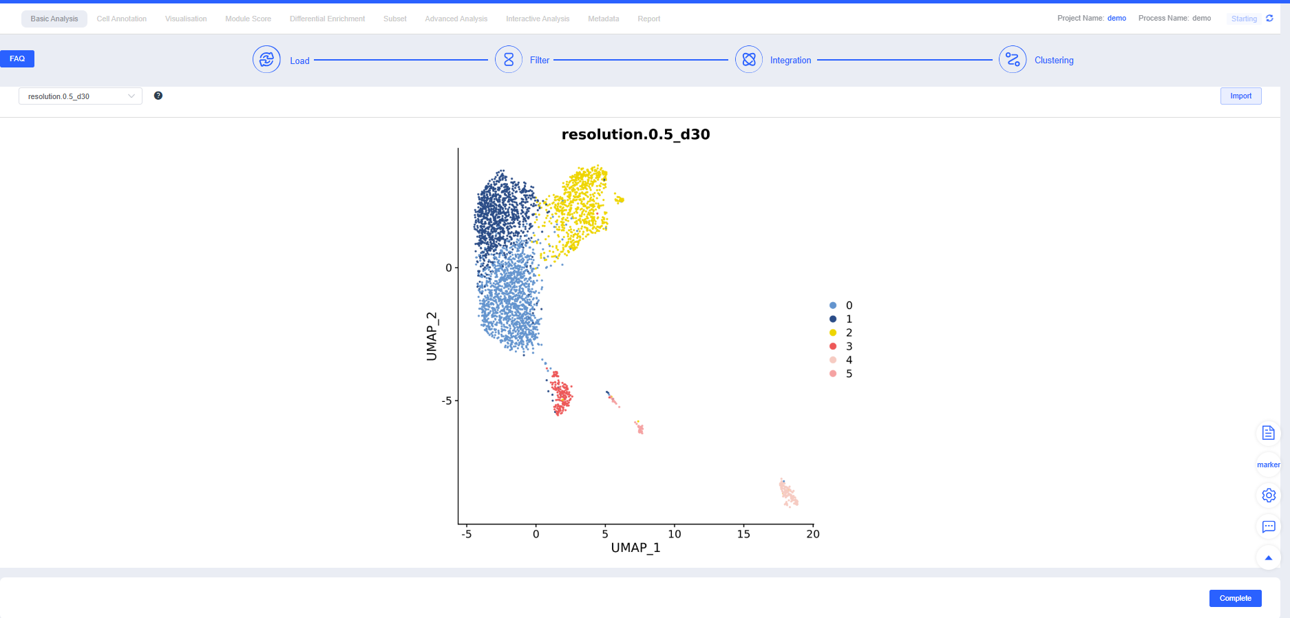 If no further adjustments are needed after Clustering, click Complete to jump to the Cell Annotation module and begin downstream single-cell analyses. This step takes some time—please be patient.