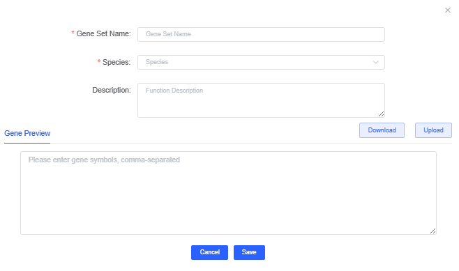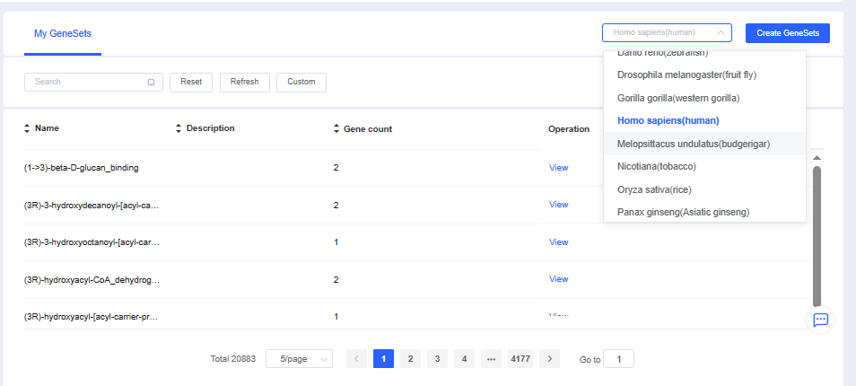 1. [View] Gene Sets: Each gene set includes the gene set name, species, and a preview of genes separated by commas.