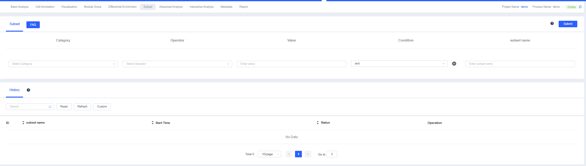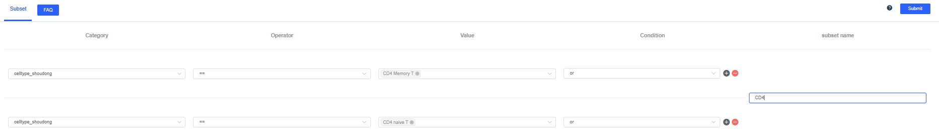 2. Use the + button after Condition to add multiple filters, or the button to remove a filter. Once set, click Submit (upper right) to apply the rules, filter the subset, and record it in History.