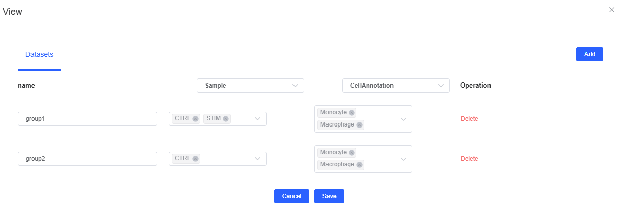 humanormouse. - Config: After configuring the first row, click [Add], customize group names in the first column, select samples (multiple selection allowed) in the second column, and select cell types (multiple selection allowed) in the third column.