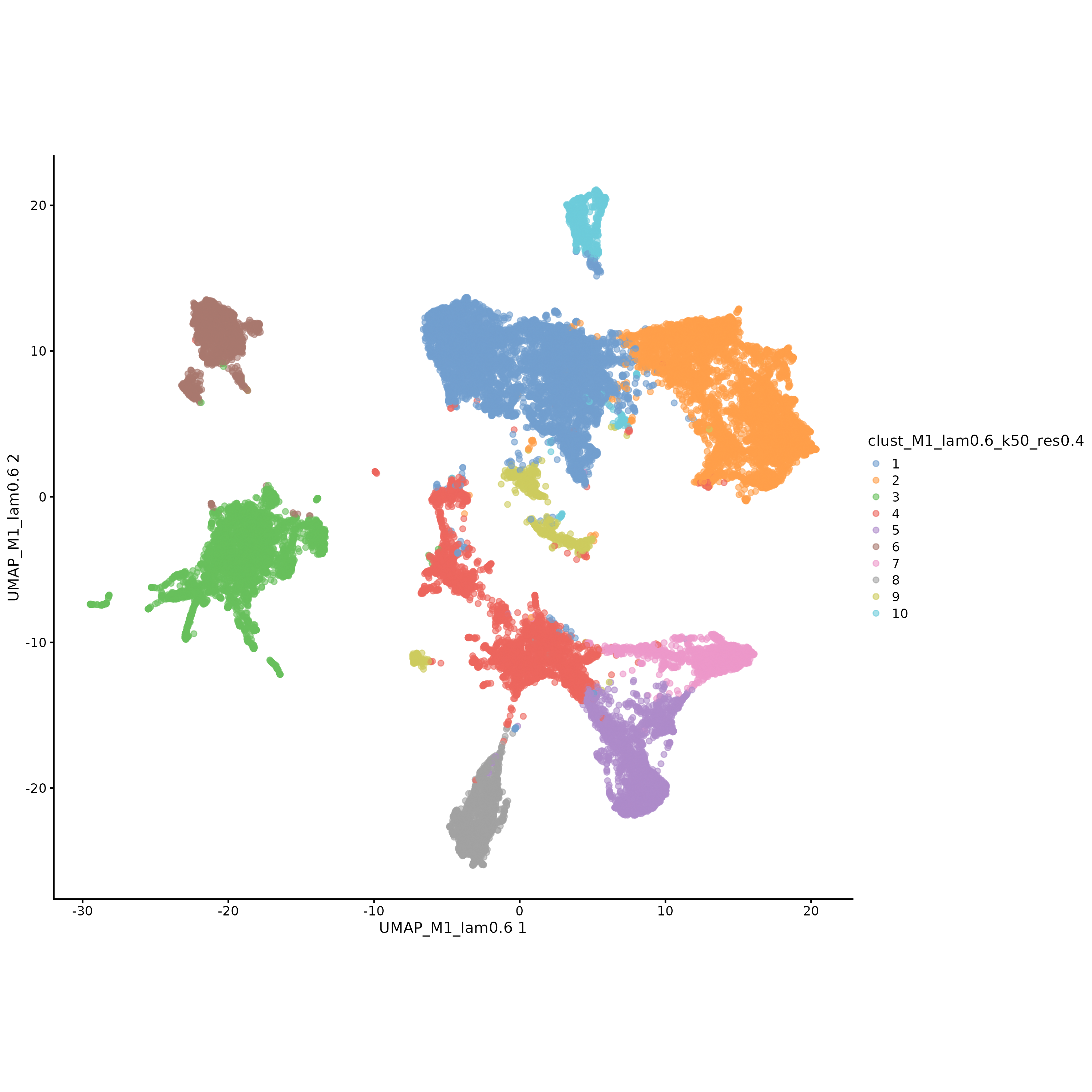 *_clust_M1_lam*_k50_res*_umap_plot.png/pdf | UMAP dimensionality reduction visualization maps under different λ and resolutions, showing the distribution of cells in the dimensionality reduction space | PNG/PDF |