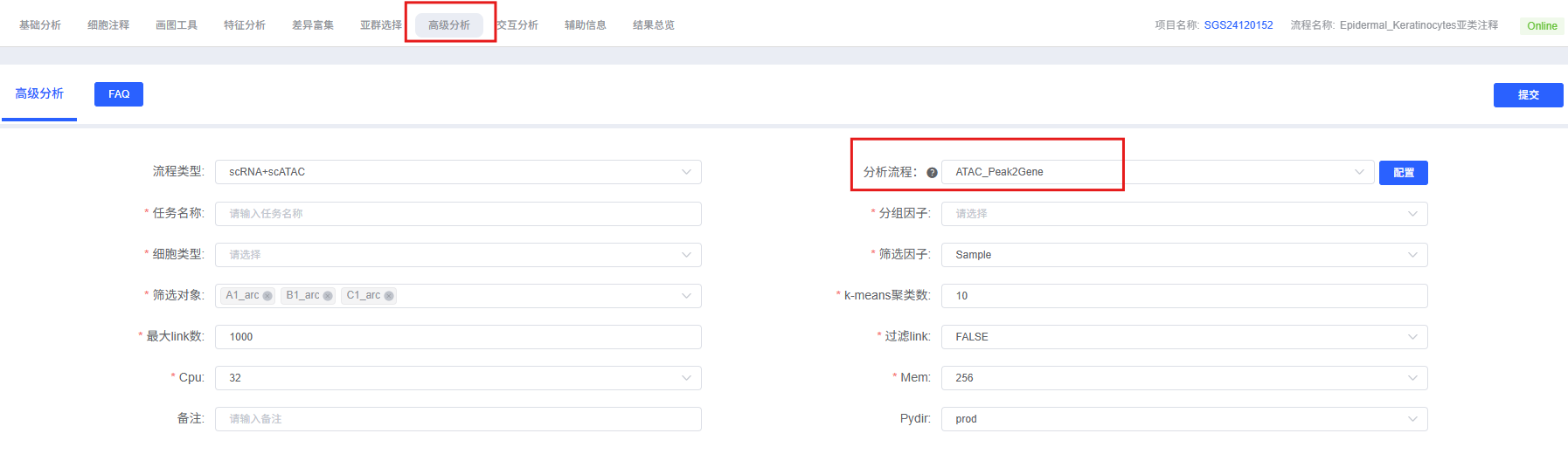 On the cloud platform, the Peak2Gene analysis workflow is designed to be intuitive and easy to use. You do not need to write code; you can complete the analysis through the parameter configuration interface.