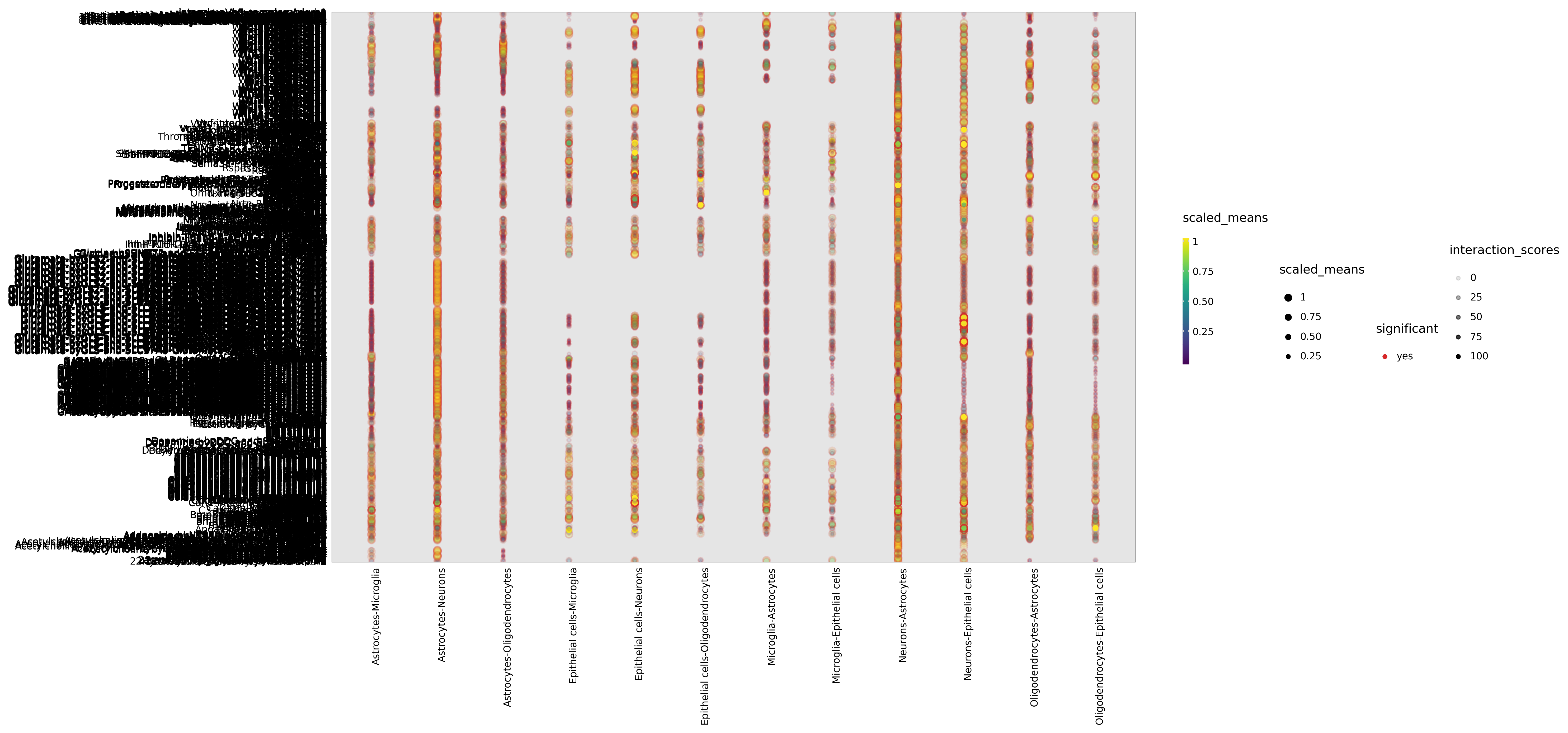 • Significant interactions: Larger and darker points indicate that the ligand-receptor pair has high expression and significance in the cell type pair